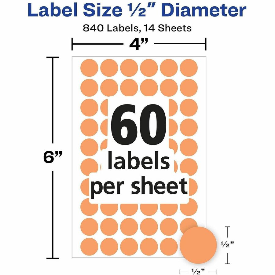 1/2" Diameter - Removable Adhesive - Round - Orange - Paper - 60 / Sheet - 840 / Pack