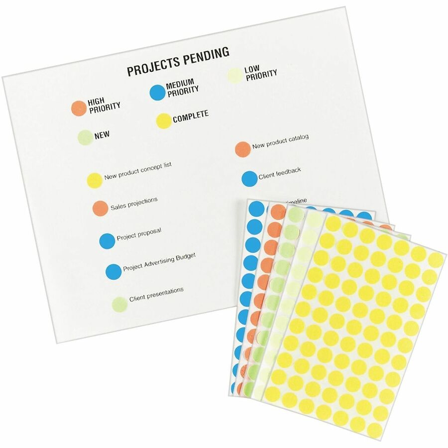 | Marketing Information | Your organization system can be spot-on with these removable color-coding labels. The small size makes them ideal for adding emphasis to documents, controlling inventory, marking prices and more. Keep track of related objects, mark important dates on your calendar or use for a variety of other purposes where it's important to catch the eye quickly. The labels are removable so you can place them firmly yet remove them when no longer needed. Labels come on a 4" x 6" sheet with 60 labels per sheet. |