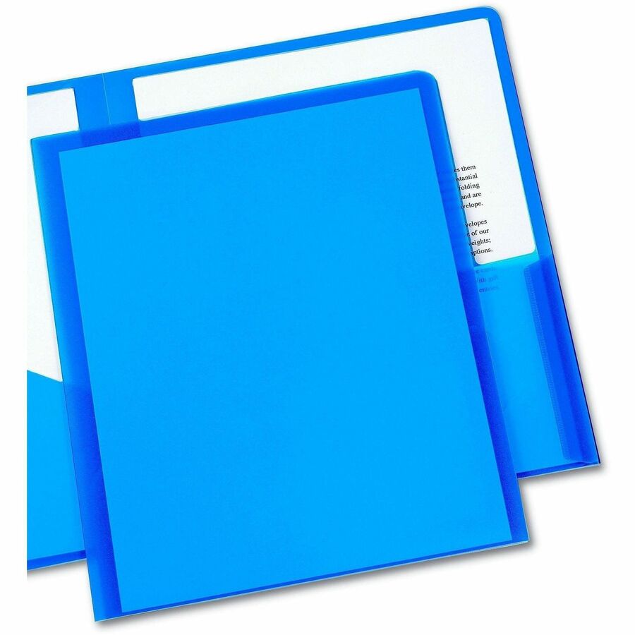 | Marketing Information | Two-pocket translucent folders offer durability and style for presentations or general office use. Made of durable, water-resistant polypropylene, lightweight, these flexible folders are tough enough to withstand frequent use. Polypropylene material won't lift print. Two interior pockets provide room for loose papers and booklets. Folders include business card slots on the right inside pocket. |