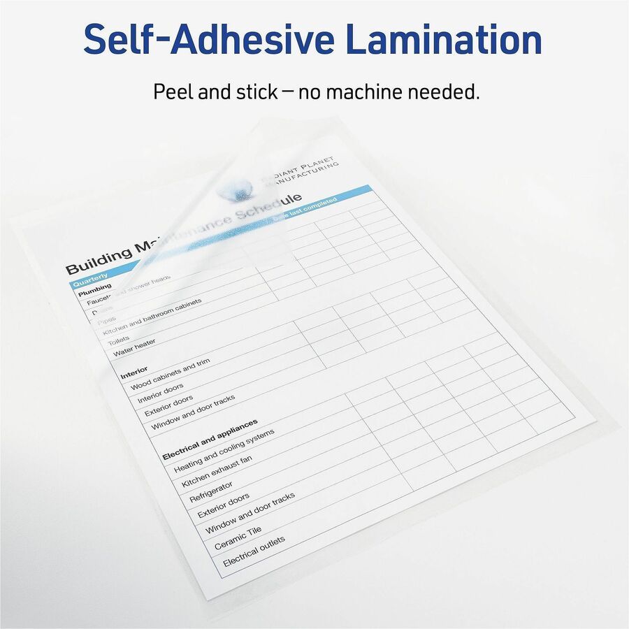 | Marketing Information | Use self-adhesive, laminating sheets for quick laminating. No special equipment is needed to seal important documents for convenient long-term protection. Self-adhesive laminating is also less expensive than thermal lamination. Simply use the included grid to size the document, place the document on the adhesive side of one sheet, lay the second sheet adhesive-side down to seal the other side of the document and trim the edges for a laminated document that looks professional. |