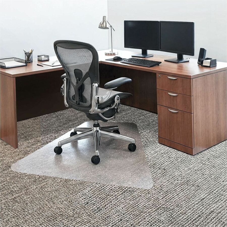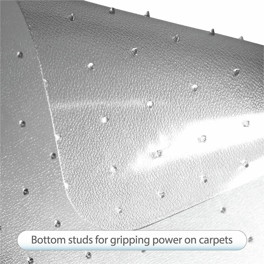 | Marketing Information | Chairmat with lip is ideal for medium-pile carpets and works best on carpets up to 3/4" thick, including padding. Shape makes it perfect for L-shape desk configurations. Studded back keeps the mat in place on a variety of carpet styles. Smooth edge is designed for easy on-off chair movement. Chairmat offers crystal-clear design and optimal protection for your carpet. Lip measures 20" x 12". |