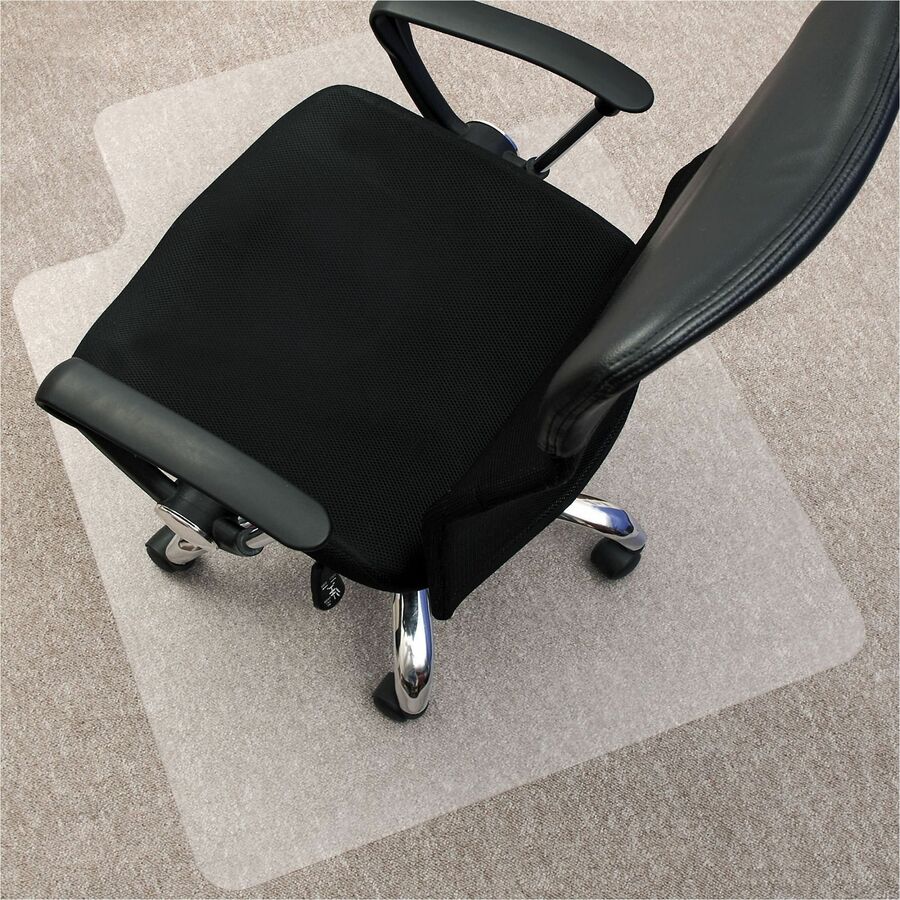 | Marketing Information | Clear rectangular chairmat will extend the life of your carpet by spreading out the pressure from your chair casters. It will also reduce fatigue by allowing easier rolling across your work space with less back and leg strain. Use on medium-plush carpets including padding. Studded back is designed to achieve a strong grip without piercing or damaging your carpet backing, smooth edge for smoother rolling on and off your mat, and a 25" wide x 12" deep lip to cover the carpet under your desk when your chair is pushed all the way in. Crystal-clear chairmat lets the beauty of your carpeting show through. Heavy-duty material stands up to daily wear and tear. |